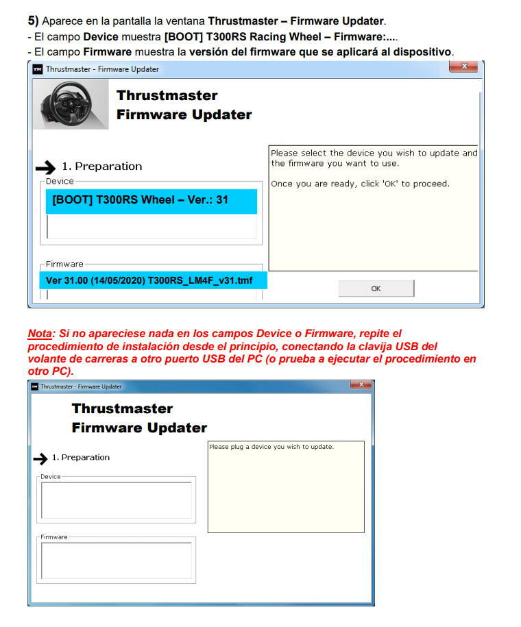 Segundo paso instalar el firmware de nuevo desde la aplicación de panel de control Thrustmaster.