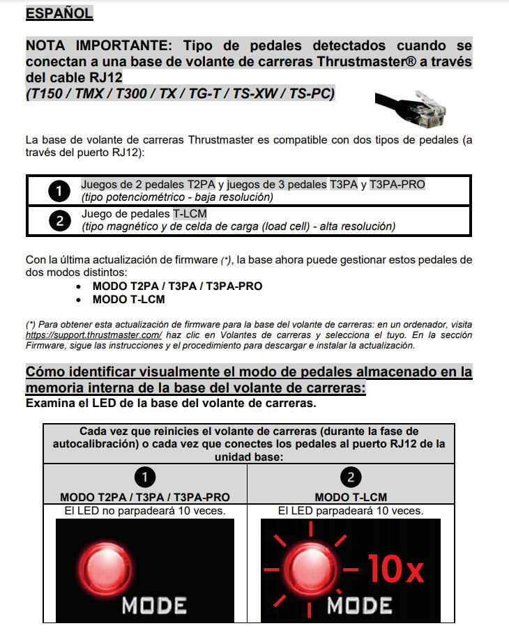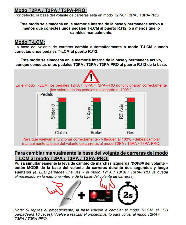 tengo un t300 actualizado con la última versión (33.00) conecto los pedales t lcm (10 parpadeos ) y no me funcionan al 100%, si paso a pedales t3pa manualmente (2 parpadeos) funcionan al 100%. Los pedales los he calibrado antes de todo este procedimiento. A alguien más le ha pasado?