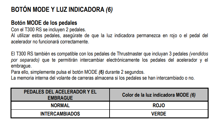 Hola tengo el t300rs y he comprado los pedales t-lcm pero el pedal del acelerador es el del embrague y el del embrague el acelerador, el botón mode está en verde y aunque lo pulse 2 seg no cambia a rojo, hay alguna solución para eso?? Gracias